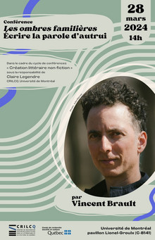 Dans le cadre du cycle de conférences du cours « Création littéraire non-fiction », sous la responsabilité de Claire Legendre (cochercheuse CRILCQ, Université de Montréal), Vincent Brault donnera la conférence « Les ombres familières - Écrire la parole d'autrui ». L'événement se tiendra le 28 mars 2024, dès 14h, à l'Université de Montréal, pavillon Lionel-Groulx (C-8141).