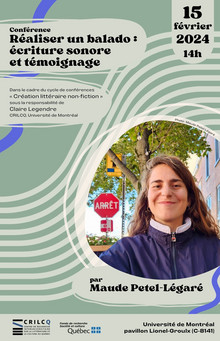 Conférence-rencontre de Maude Petel-Légaré dans le cadre du cours FRA2708 'Création littéraire - Non-fiction' de Claire Legendre