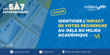 Cet atelier vous donne la chance d'explorer davantage le potentiel d’impact de vos résultats de recherche, et ce, au-delà du milieu académique. Cet atelier est un espace de réflexion qui vous permettra d’explorer de nouvelles opportunités et de vous en nourrir afin de décupler votre impact. Vous recevrez les outils nécessaires pour transformer votre recherche universitaire en une entreprise qui change le monde.