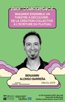 Benjamin Alonso Barreña (stagiaire postdoctoral CRILCQ, UQTR) donnera la conférence « Imaginer ensemble un théâtre à découvrir: de la création collective à l'écriture de plateau ». L'événement se tiendra le 28 novembre 2023, dès midi, à l'Université de Montréal, pavillon Lionel-Groulx, local C-8141.