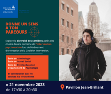 Cet événement s’adresse à la communauté étudiante en CRIMINOLOGIE, PSYCHOÉDUCATION, PSYCHOLOGIE ET TRAVAIL SOCIAL, et a comme fil conducteur l’INTERVENTION. Vous y rencontrerez des employeurs, des diplômés et des professionnels du milieu avec des parcours riches et passionnants.
