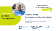 Dans le cadre de la Semaine mondiale de l'entrepreneuriat, Millénium Québecor, en collaboration avec le CEuMONTRÉAL et la semaine des entrepreneurs à l'école, vous invite à rencontrer Cédrick Audel, fondateur de l’agence Unikeo Sports inc.