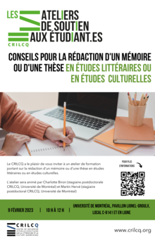 Le CRILCQ a le plaisir de vous inviter à un atelier de formation portant sur la rédaction d'un mémoire ou d'une thèse en études littéraires ou en études culturelles.