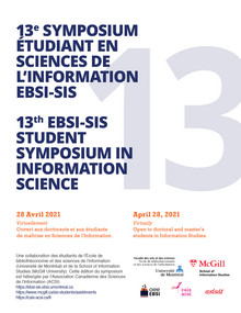 Le Symposium annuel EBSI-SIS, organisé conjointement cette année par l’École de bibliothéconomie et des sciences de l’information (EBSI) de l’Université de Montréal et l’École des études en information (SIS) de l’Université McGill, se déroulera virtuellement le 28 avril 2021 et donnera l’occasion aux étudiants à la maîtrise et au doctorat de présenter leurs travaux de recherche et de rencontrer leurs pairs.
