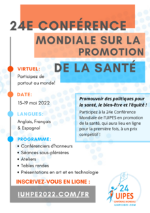 Cet évènement majeur de l’Union internationale de Promotion de la Santé et d’Education pour la Santé (UIPES) a lieu tous les trois ans et se déroulera en mode virtuel du 15 au 19 mai 2022 à partir de Montréal, au Québec.