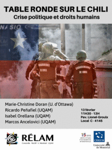 Les panélistes, qui ont participé à la Mission canadienne d’observation des droits humains au Chili qui a eu lieu du 18 au 27 janvier 2020, feront un portrait de la situation et rendront compte de leurs résultats préliminaires.