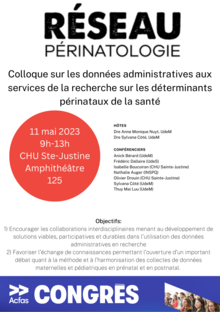 Le Réseau présentera un colloque au Congrès de l'ACFAS le 11 mai prochain, sous le thème de l'utilisation des données administratives dans la recherche en périnatalité. L'évènement se déroulera au CHU Sainte-Justine.