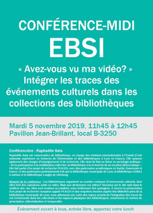 Conférence-midi à l'EBSI- 'Avez-vous vu ma vidéo?' Intégrer les traces des événements culturels dans les collections des bibliothèques