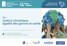 L’activité propose un tour d’horizon à travers l’intervention de quatre panélistes qui partageront le fruit de leurs analyses et réflexions sur l’importance de la santé et de l’égalité des genres lorsqu’on lutte ou qu’on s’adapte aux changements climatiques. Ces présentations seront suivies d’une période d’échanges avec le public, qui permettra d’approfondir les discussions