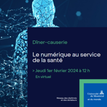 Le Réseau des diplômés et des donateurs vous invite au premier événement virtuel de l'année pour échanger avec 4 personnes expertes, issues de divers secteurs, sur le thème captivant du numérique au service de la santé des humains et des animaux.