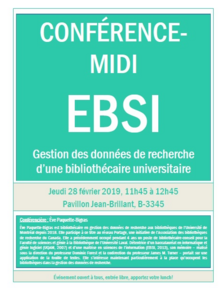 La conférence-midi portera sur la gestion des données de recherche dans la perspective d’une bibliothécaire universitaire. En poste depuis quelques mois, la conférencière vous fera part de quelques questionnements et de ses primes réflexions sur la gestion des données de recherche. Qu’est-ce qu’une donnée de recherche? Qu’est-ce la gestion des données de recherche? Comment devient-on bibliothécaire en gestion des données de recherche? Quels en sont les principaux enjeux? Quels en sont les principaux avantages? Dans quel contexte s’inscrit la gestion des données de recherche? Quel sera l’impact de la nouvelle Politique sur la gestion des données de recherche des trois organismes subventionnaires fédéraux (CRSH, CRSNG, IRSC)?