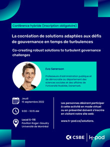 Pour répondre à cette question, le H-pod et le Commissaire à la santé et au bien-être vous convoquent à la conférence « La cocréation de solutions adaptées aux défis de gouvernance en temps de turbulences » avec notre conférencière invitée, la professeure Eva Sørenson de Roskilde University.