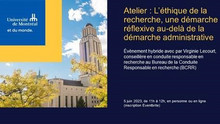 Nous avons le plaisir de vous inviter à l’atelier 'L'éthique de la recherche, une démarche réflexive au-delà de la démarche administrative' organisé par le vice-décanat à la recherche, découverte et création de la Faculté des Arts et des Sciences. Cet événement hybride aura lieu le 5 juin 2023 à 11h dans la salle C-1017-02 du pavillon Lionel-Groulx et sera diffusé sur la plateforme Zoom.