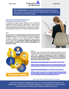 Entre-temps, chers chercheurs et chères chercheuses de l’UdeM, le Centre européen-canadien pour l'innovation et la recherche (ECCIR) et l'agence de conseil Visnea - proposent conjointement une série de webinaires en deux parties complémentaires qui se tiendront le 24 et 31 mai 2023 pour fournir des informations plus détaillées sur les opportunités présentes etfutures dans le cadre d'Horizon Europe.