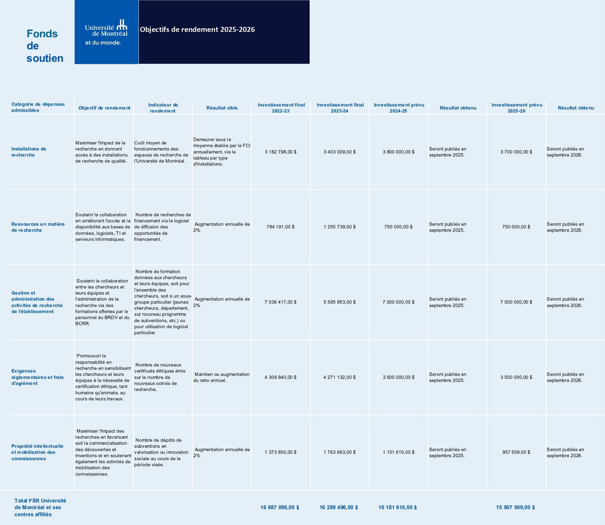 Le gouvernement utilise les données des exercices 2019-2020, 2020-2021, 2021-2022, 2022-23, 2023-24, 2024-25 et la somme des financements utilisée pour le calcul des frais indirects de recherche s’élève en moyenne annuellement à 103M$ pour UdeM. Le montant versé par le FSR représente un apport de près de 16 % de ces financements et appuie les autres sources de financement internes et externes pour le soutien à l’activité générale de recherche de l’Université de Montréal, la plus grande université de recherche francophone en Amérique.