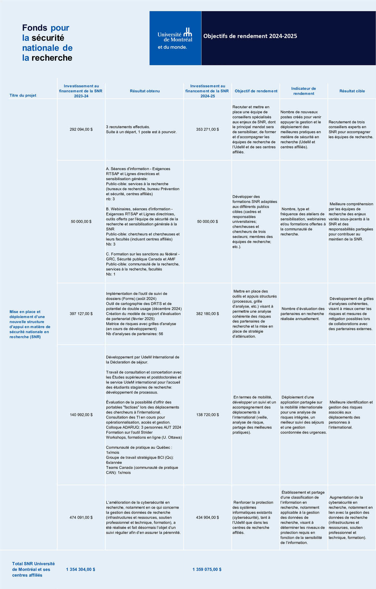 L’Université de Montréal a déposé une demande en 2023-24 d’un montant global de 1 354 304$. Au cours des trois prochaines années (2023-26), l’Université de Montréal vise, grâce à ces appuis annuels, à mettre en place une équipe de service-conseil, dont les principaux mandats seront de sensibiliser, former et conseiller la communauté de recherche aux meilleures pratiques en matière de sécurité nationale. Les mesures déployées grâce au programme SPS permettront de renforcer et d’enrichir les mécanismes d’appui transversaux, grâce à la mise en place d’actions concrètes (politiques, services-conseils, développement d’outils, webinaires et formation, etc.); le tout sera réalisé avec le concours de l’ensemble de la communauté UdeM, incluant son vaste réseau de centres de recherche affiliés.