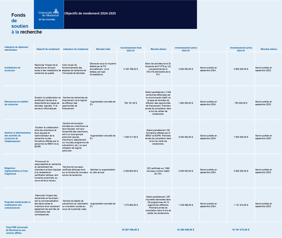 En lien avec le nouveau Plan d'action Recherche, découverte, création et innovation 2022-2027, l'Université de Montréal a revu ses objectifs de rendement du FSR pour les mettre en relation avec les priorités d'action du vice-rectorat à la recherche :